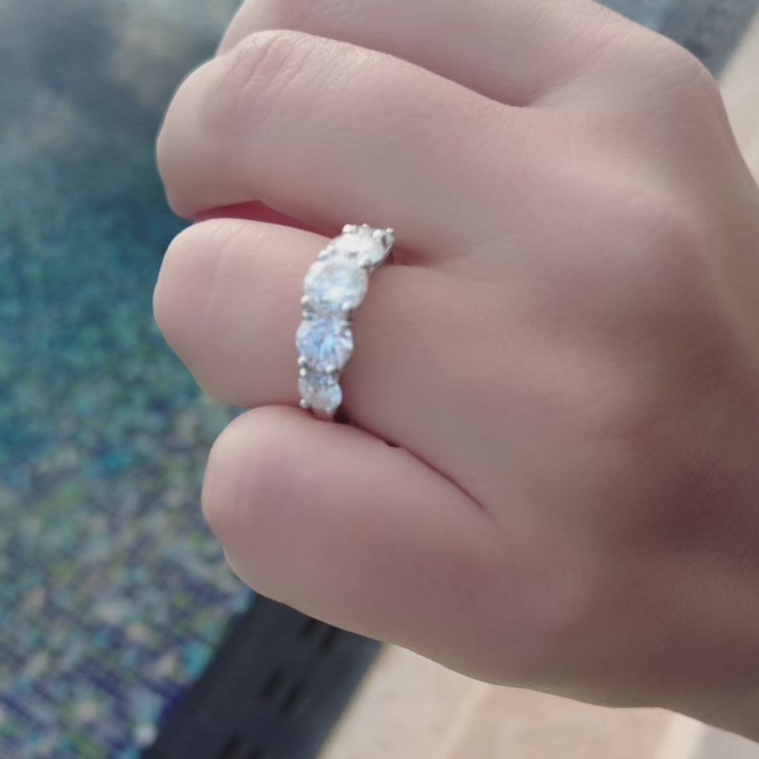 Der „Eleganter Symphony“ Ring verbindet klare Linien mit maximalem Funkeln. Gefertigt aus poliertem 925er Sterlingsilber, besetzt mit mehreren runden Labordiamant Moissaniten entlang der Ringschiene (Gesamtgewicht ca. 3,6 Karat). Ideal als Solo-Statement oder zum Kombinieren.