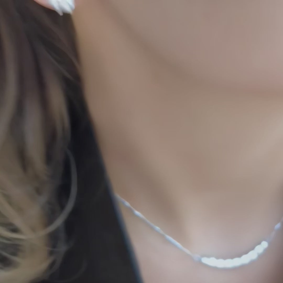 Die „Moonlight Cascade“ Halskette inszeniert eine sanft geschwungene Reihe aus funkelnden Moissaniten, die wie ein Mondlichtbogen wirken. Gefertigt aus 925er Sterlingsilber, bietet sie klaren Glanz und hohen Tragekomfort – ideal für Alltag und besondere Anlässe.