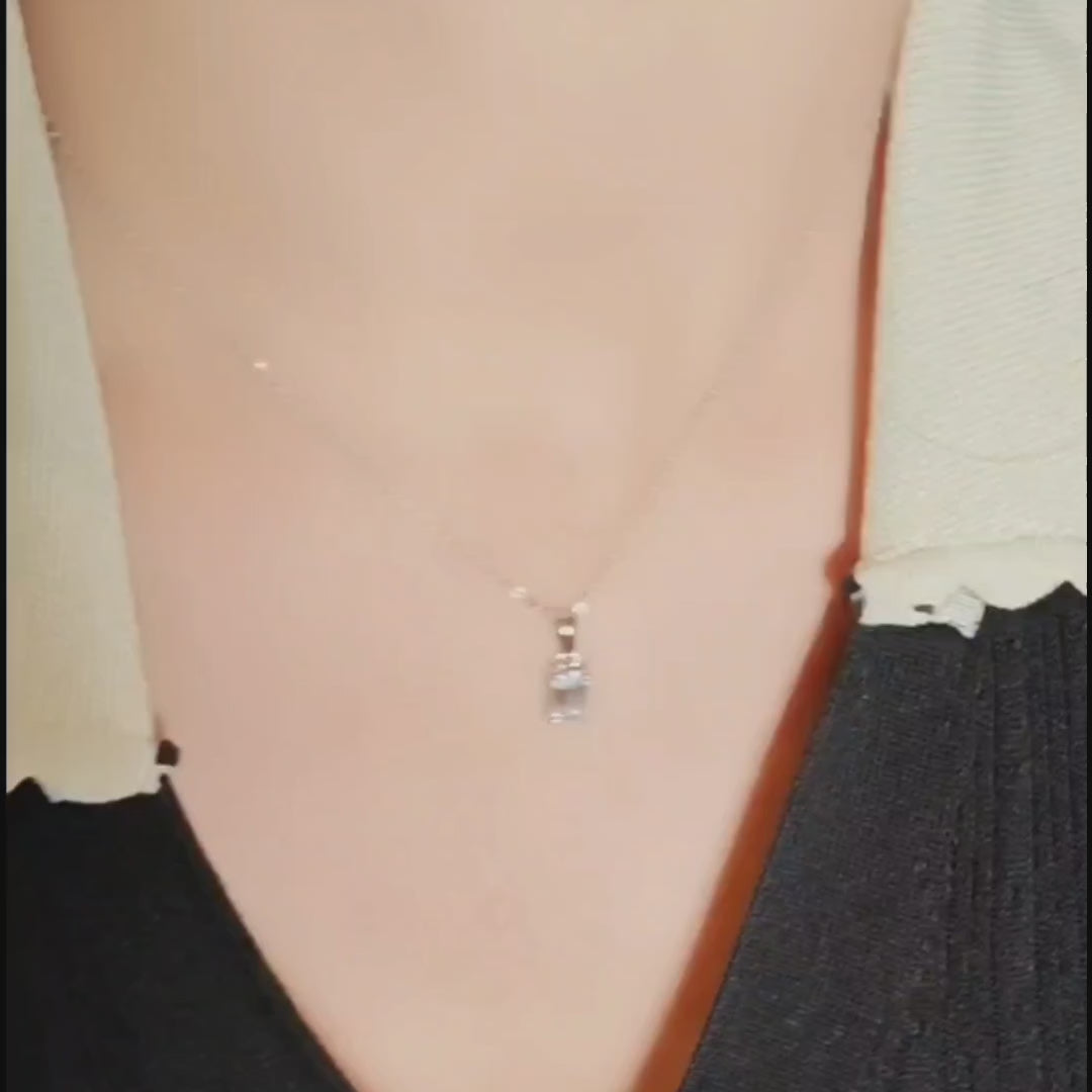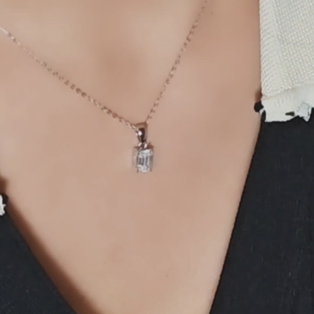 Die „Brilliance Eternal“-Halskette zeigt einen rechteckigen Labordiamant Moissanit im Smaragdschliff als Solitär. Zwei Varianten: 1 Karat (5 × 7 mm) oder 2 Karat (6 × 8 mm). Gefertigt aus 925er Sterlingsilber; Kettenlänge verstellbar von 40 bis 45 cm.